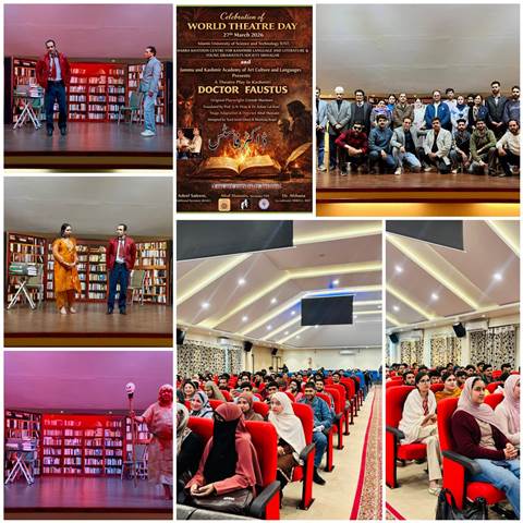 A Kashmiri theatre play titled “Doctor Faustus” was successfully staged on the occasion of World Theatre Day, 27th March 2026, at the Nundreshi Auditorium, Islamic University of Science and Technology. The event was jointly organised by the Young Dramatists Society and the Habba Khatoon Centre for Kashmiri Language and Literature in collaboration with the Jammu and Kashmir Academy of Art Culture and Languages. Originally written by Christopher Marlowe, the play was presented in Kashmiri through translation and stage adaptation by Dr. Sohan Lal Koul. The production was directed by Altaf Hussain, with design contributions from Mushtaq Baqal and Syed Javid Gilani. Music for the play was composed by Imran Latief. On the occasion, Dr. Afshana (Coordinator, HKCKLL), Dr. Bisati, Dr. Syed Iftikhar Ahmad (JKAACL), Dr. Gulzar Rather (JKAACL), and music composer Imran Latief were felicitated by HKCKLL (IUST) for their valuable contributions. Mohammad shafi khan sayil Arjmand Andrabi , Sheikh Shuja, Fatima Sheikh , Mehar Shafi , Sana Khan, fida , sabir rather , Usama bin kondroo , numan manzoor , munazah yousuf, wasaqat mehraj, galib rashid , shamiq parvaiz, shabzah malik , moomin bashir . The performance witnessed a large and enthusiastic audience, particularly students from IUST. The play not only captivated the audience but also served as an inspiration for young students to actively participate in theatre and cultural activities.