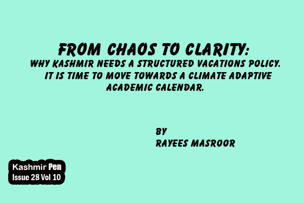 The changing climatic conditions in the valley, including prolonged heatwaves and changes in snowfall pattern, have necessaited the need for a more logical, flexible and climate adaptive approach to vacations. The current situation and the harsh weather conditions demand a review of the existing vacation policy to ensure the well-being of students without compromising the school instructional days.Kashmir division urgently needs a meticulously planned and standardized calendar for winter and summer break with pre decided dates keeping in view the changing weather patterns. This would help to avoid the recurring confusion, unnessary social media debates, and last minute announcements that eventually disturb the planning. A well thought out, advance vacation schedule would help students, teachers, and parents to manage academic work, travel, and personal time more efficiently. It would not be a bad idea to have a three to four week summer vacation in addition to the existing winter break, which itself could be shortened by a week if needed and keeping in view the number of instructional days.