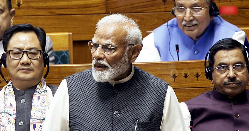 Replying to the debate in Lok Sabha on the motion of thanks on the President’s address, PM Modi also took “AAPda” jibe at the Aam Aadmi Party and “Sheeshmahal” swipe at Kejriwal.