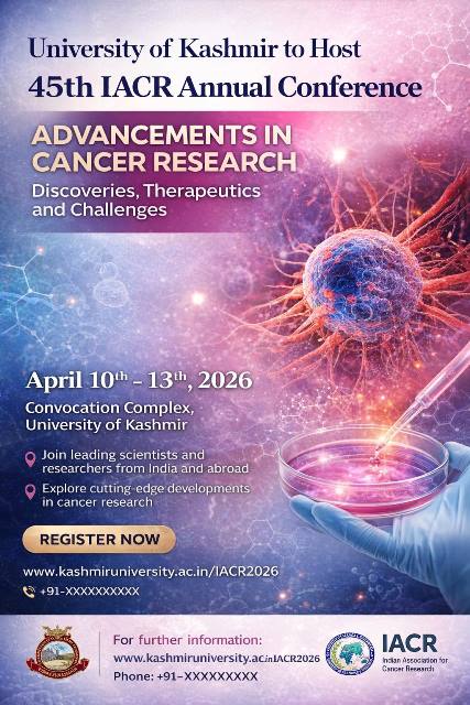 Srinagar, April 9: The University of Kashmir (KU), through its Department of Biochemistry, is set to host the 45th Annual Meeting of the Indian Association for Cancer Research (IACR), alongside an international conference titled “Advancements in Cancer Research: Discoveries, Therapeutics and Challenges.”