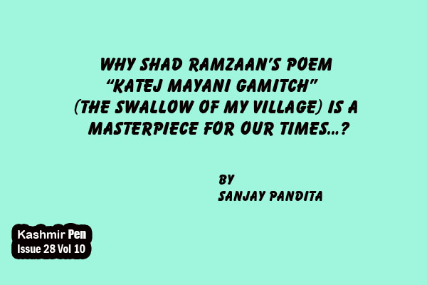 There are poems that speak in whispers and yet thunder through the corridors of time—words woven with such quiet urgency that they haunt not by their volume, but by their veracity. Shad Ramzaan’s Katej Mayani Gamitch (The Swallow of My Village) is one such rare creation. It is not merely a poem—it is a reckoning. A mirror held up to our broken civilizational compact, a lament rendered through the fluttering return of a bird, and an elegy not just for a village, but for an entire moral ecology slipping through our fingers like dry autumn leaves. In the landscape of contemporary Kashmiri poetry—and beyond—Shad Ramzaan’s work rises with the gravity of a classic, made luminous by its metaphoric depth, emotional restraint, and its devastating resonance with our shared cultural and environmental crisis.